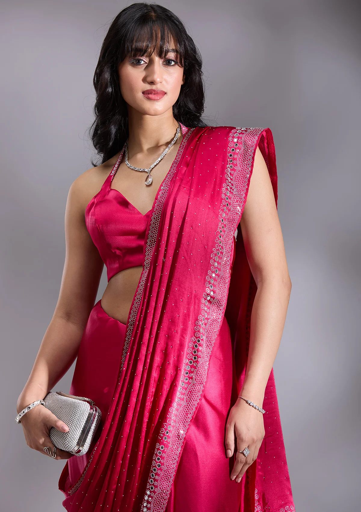Rani Pink Silver Stonework Satin Saree